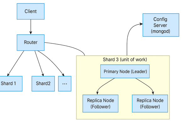 To put it more simply, look at it from the lense of “unit of data” handled in the system. In Leader-Follower model (like MongoDB), a single unit of data goes to a single node. If you look at the Leader-Follower cluster like Mongodb, it would look something like below, where there are shards, and each shard has a single Leader (Primary) and multiple Followers (Replicas). The important thing to note here is, “unit of data”, maps to a single node.