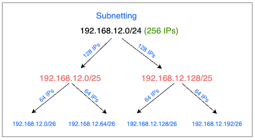 | └─ 192.168.12.192/26 | 64 | 192.168.12.192 – 192.168.12.255 |
